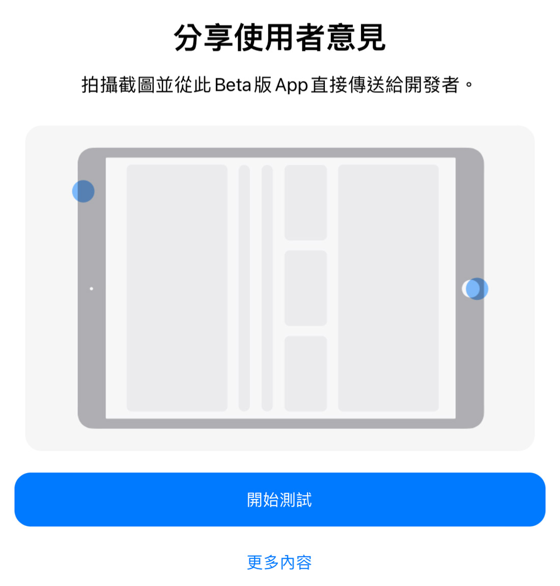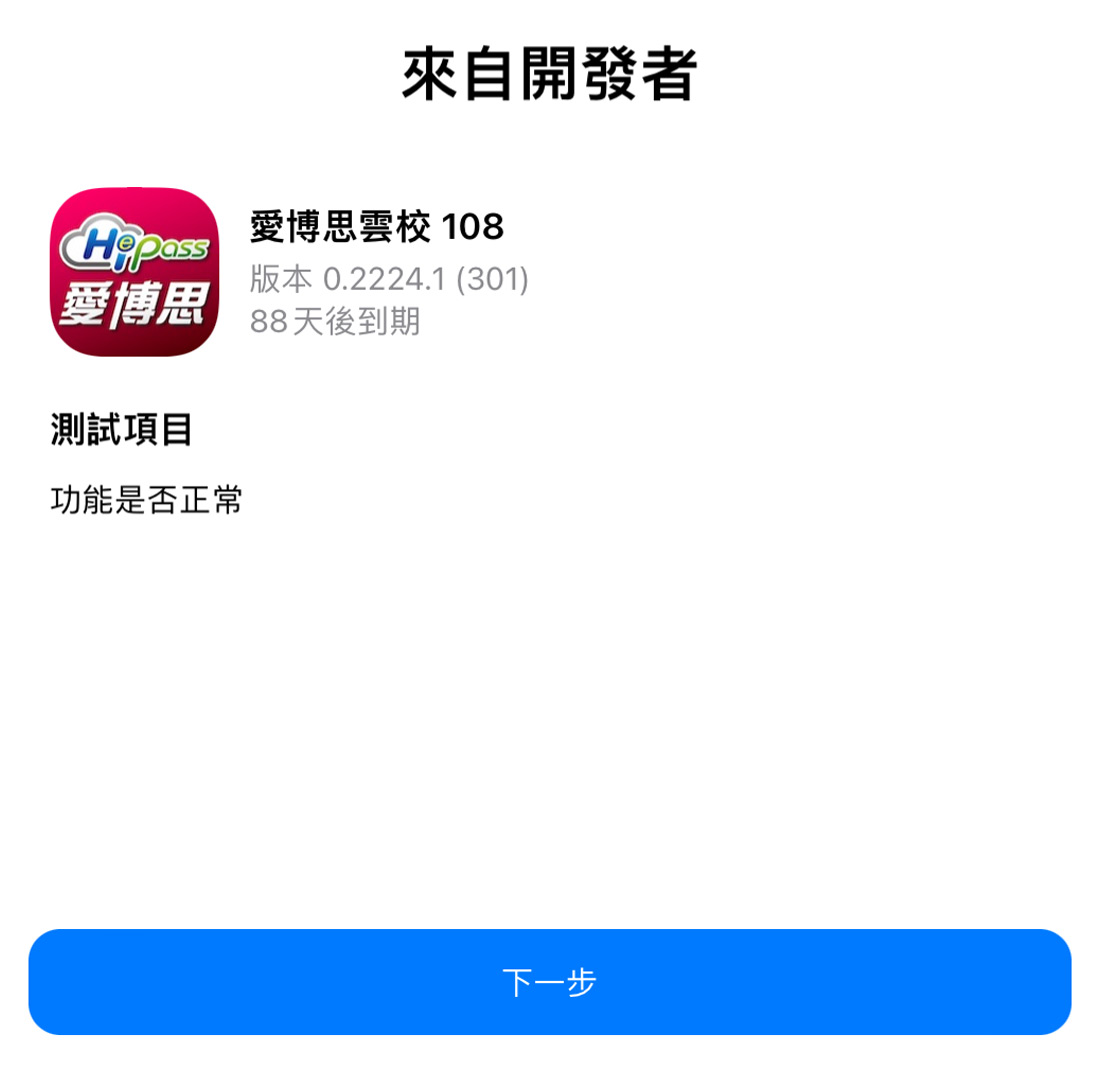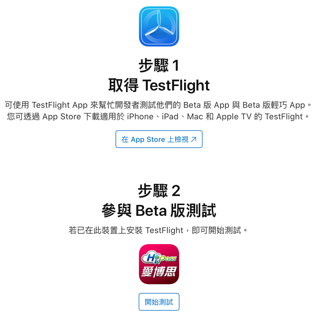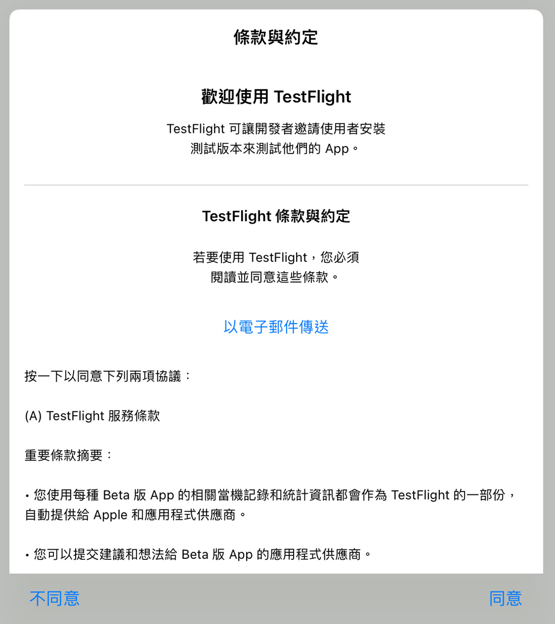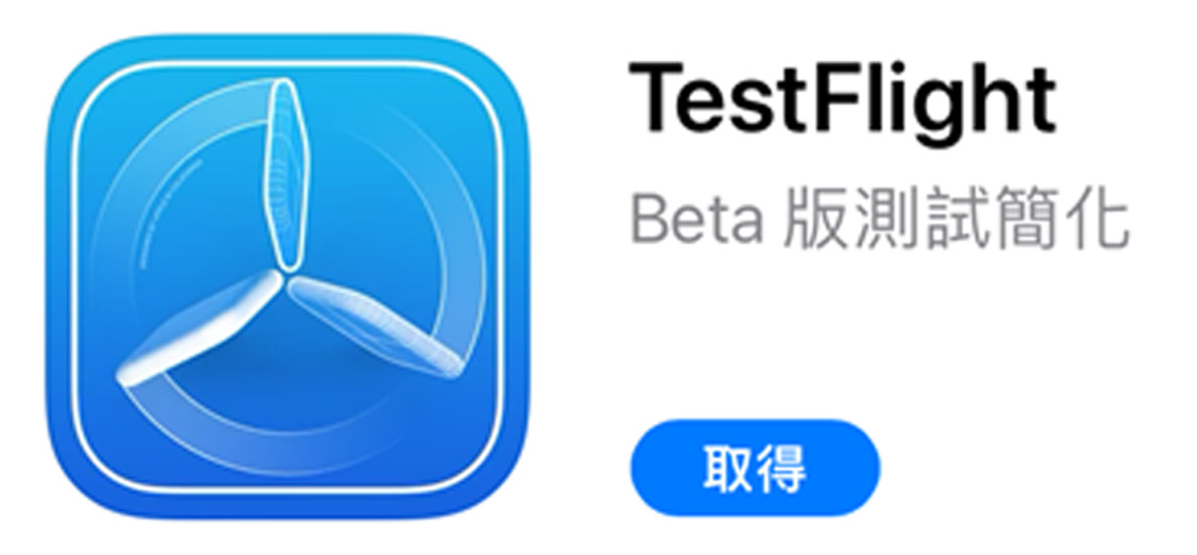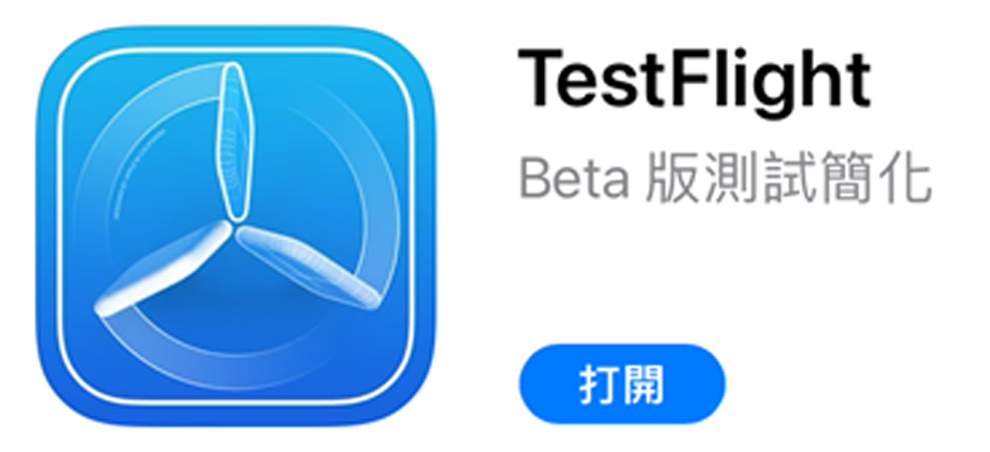 「TestFlight」安裝步驟:點選「取得」→「打開」→「同意」