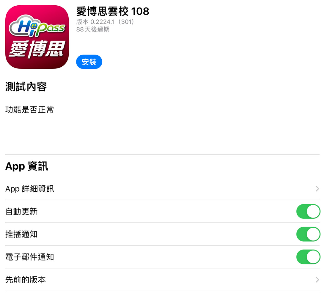 依據頁面說明先安裝「TestFlight」後安裝「愛博思Beta版」(若您的平板裝置已安裝「TestFlight」即可直接點選「愛博思圖示」安裝使用)