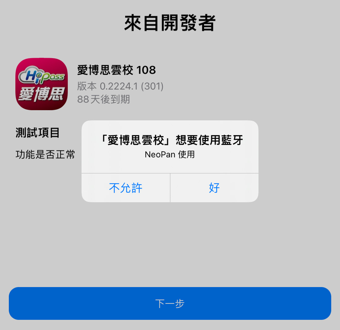 「愛博思雲校108」安裝步驟:點選「接受」→「安裝」→「打開」→「允許使用藍芽」→「下一步」→「開始測試」→登入使用