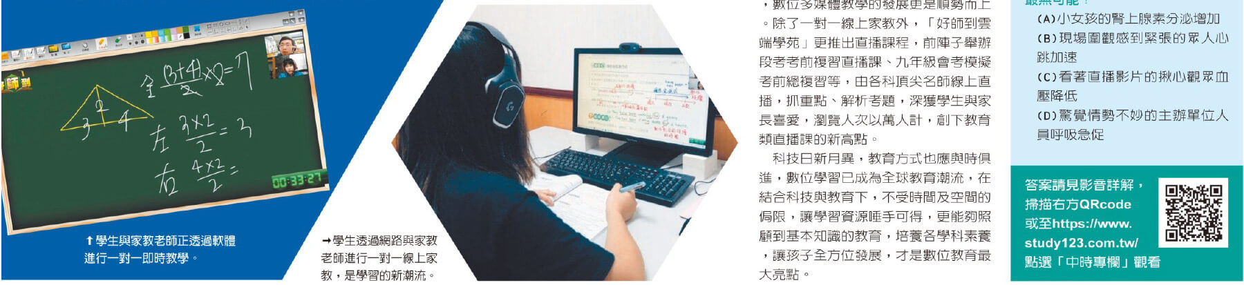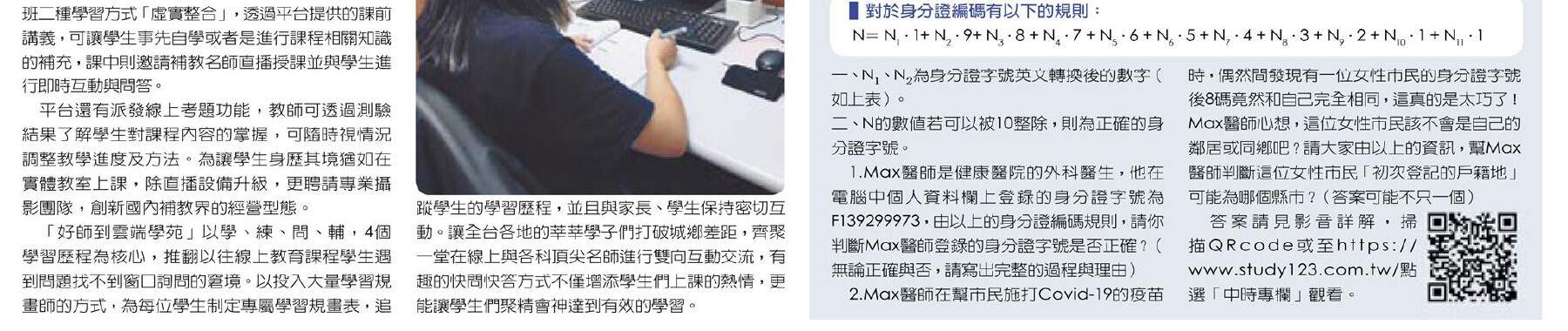 所以經親朋好友的介紹我參加了好師到雲端學苑個別指導,加強我的數理科目,線上課程的老師會按照我習慣的學習模式,用範例及題目引導我建立正確的觀念,我的強項是短期記憶,但因為有基本的觀念建立,讓我的學習思維有了大改變,等於說老師提升了我的強項又補強我的弱項。總結來說,連續上了一學期後,個人認為學習中最關鍵的地方在於學習方法的建立以及觀念的理解,如果平時就有培養出正確的學習方法,觀念也有完全理解,過去的學習經驗就可以和新的知識相結合,起到融會貫通的效果,最後非常謝謝老師的教導,重新改變我學習模式。