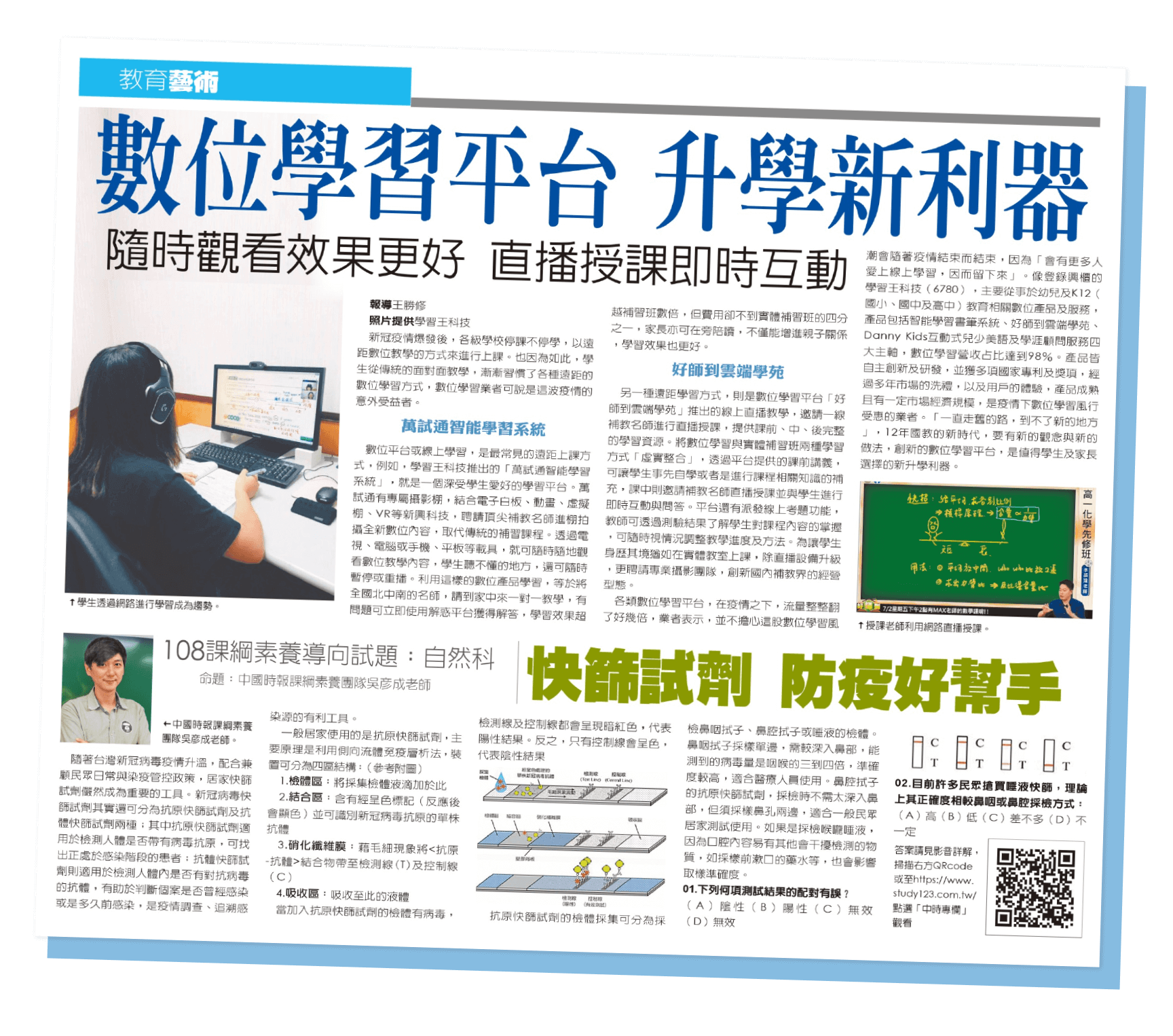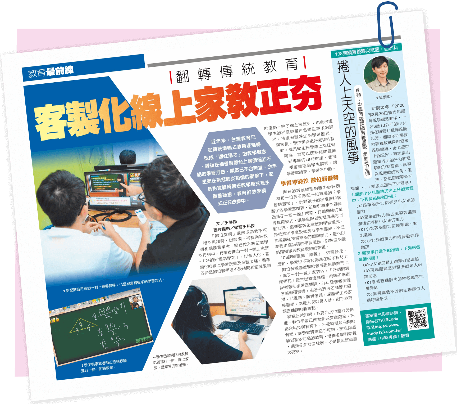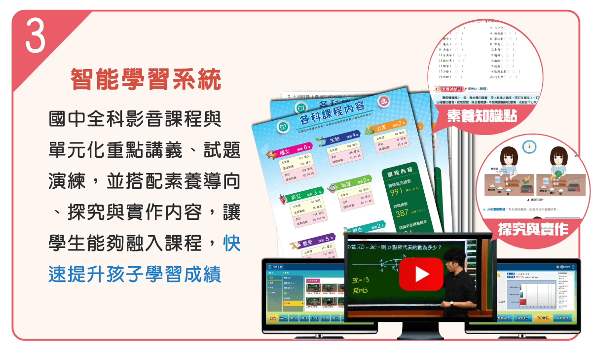 - A:網羅全省補習班權威名師,嚴選編排教學內容,內容為最新的108課綱教材,以高清畫質拍攝全科影音單元課程、素養與探究與實作課程,與在線做試題練習,並全程記下孩子學習軌跡。