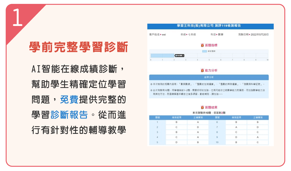 - A:免費為學生做學生成績的健康檢查,並提供完整的學習診斷報告與建議,了解需補足加強的弱科。